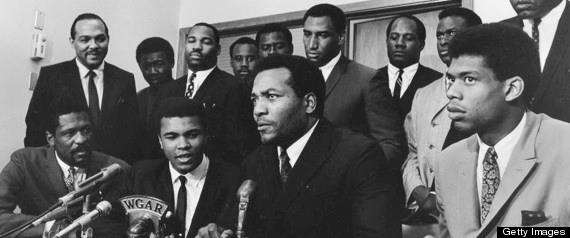 Bill Russell, Muhammad Ali, Jim Brown and Kareem Abdul Jabbar. Standing behind them: Carl Stokes, Walter Beach, Bobby Mitchell, Sid Williams, Curtis McClinton, Willie Davis, Jim Shorter and John Wooten.